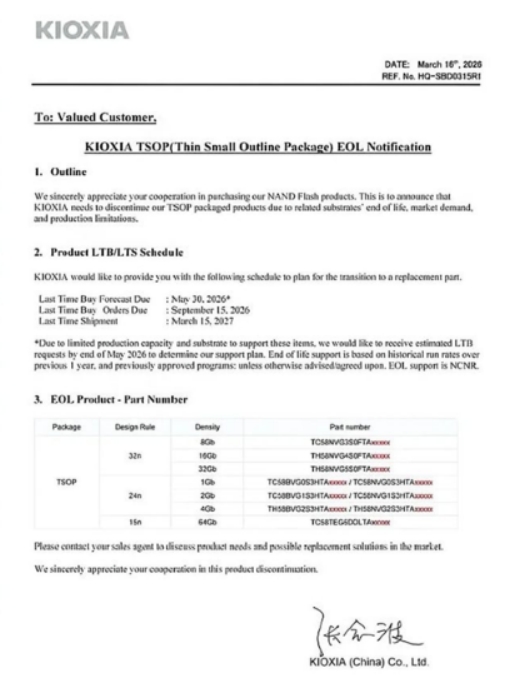 由于生產(chǎn)能力和基材限制,鎧俠表示,公司無法生產(chǎn)8Gb-64Gb的TSOP封裝產(chǎn)品。希望收到最后采購預(yù)測(即客戶最后一次下單數(shù)量)期限為2026年5月30日,以確定鎧俠的支持計劃。最后采購訂單截止日為2026年9月15日,最后出貨時間為2027年3月15日。