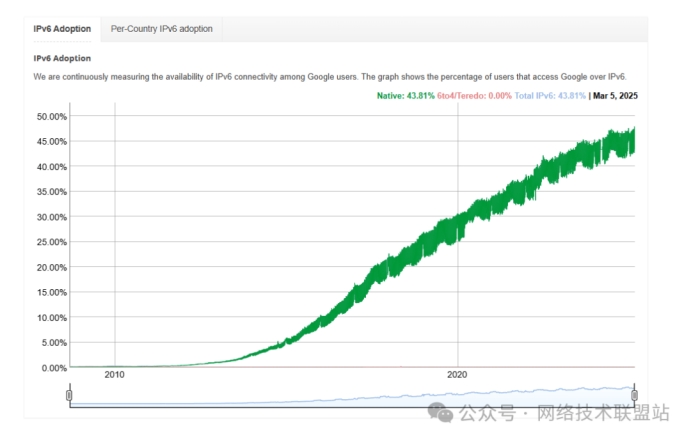 在這樣的背景下,IPv6作為下一代協(xié)議雖已推出多年,但采用率仍未達(dá)到預(yù)期。全球IPv6流量占比雖逐步提升至約43%,但大量老舊設(shè)備、應(yīng)用和基礎(chǔ)設(shè)施仍以IPv4為主,雙棧部署增加了運(yùn)維成本,許多企業(yè)選擇觀望。