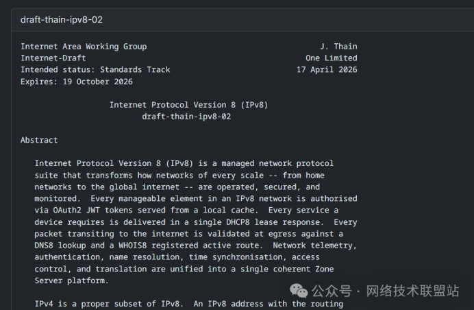 2026年4月14日,互聯(lián)網(wǎng)工程任務(wù)組(IETF)收到一份名為《Internet Protocol Version 8 (IPv8)》的核心協(xié)議草案,由百慕大公司One Limited的Jamie Thain提交。這份草案迅速成為全球科技圈焦點(diǎn)。它提出采用64位地址空間,理論上可提供2^64約1844.67億億個(gè)獨(dú)立地址,同時(shí)實(shí)現(xiàn)對(duì)現(xiàn)有IPv4協(xié)議的100%向下兼容,無(wú)需任何設(shè)備、應(yīng)用或網(wǎng)絡(luò)架構(gòu)修改即可無(wú)縫接入。